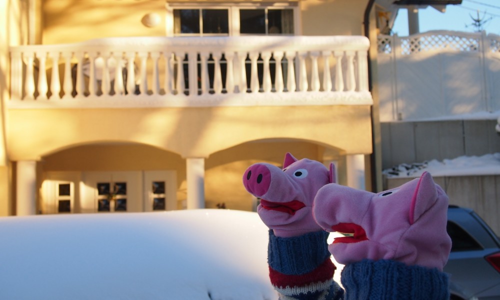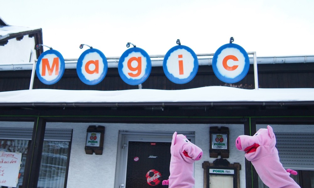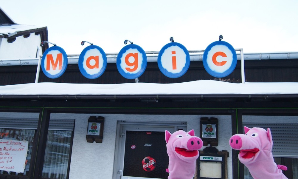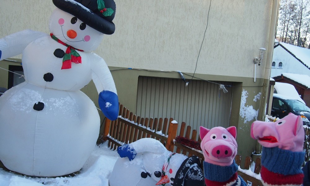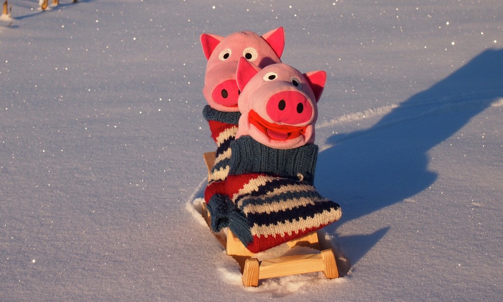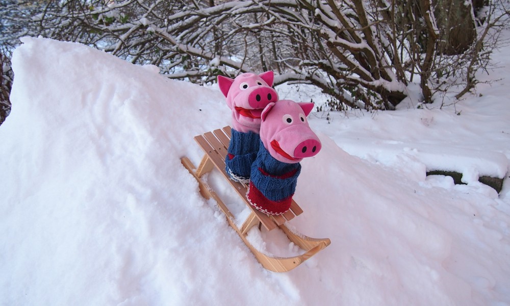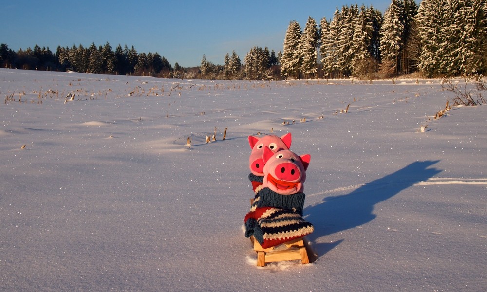 Die Schweine waren sehr erfreut als sie morgens aus dem Fenster sahen: alles weiß! Deshalb haben sie Ihren neuen Schlitten eingepackt und sind in den Westerwald gefahren.