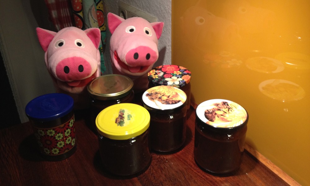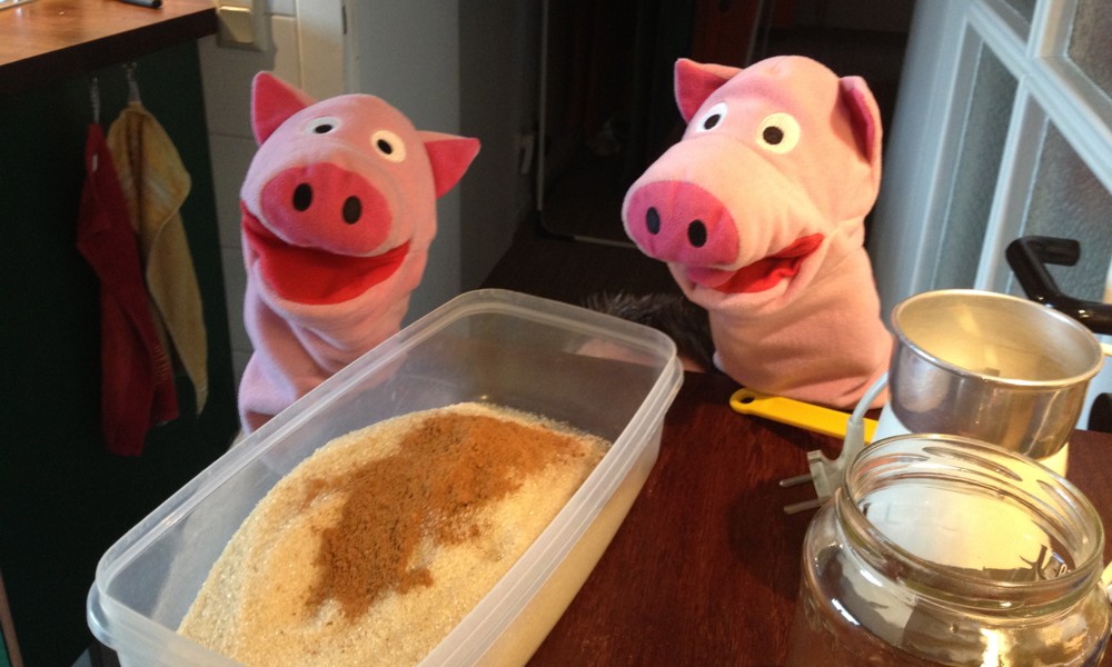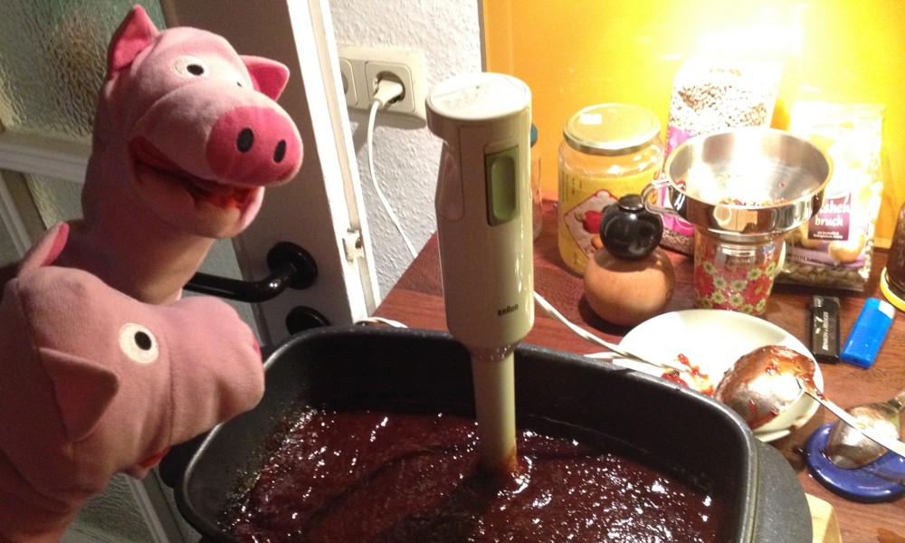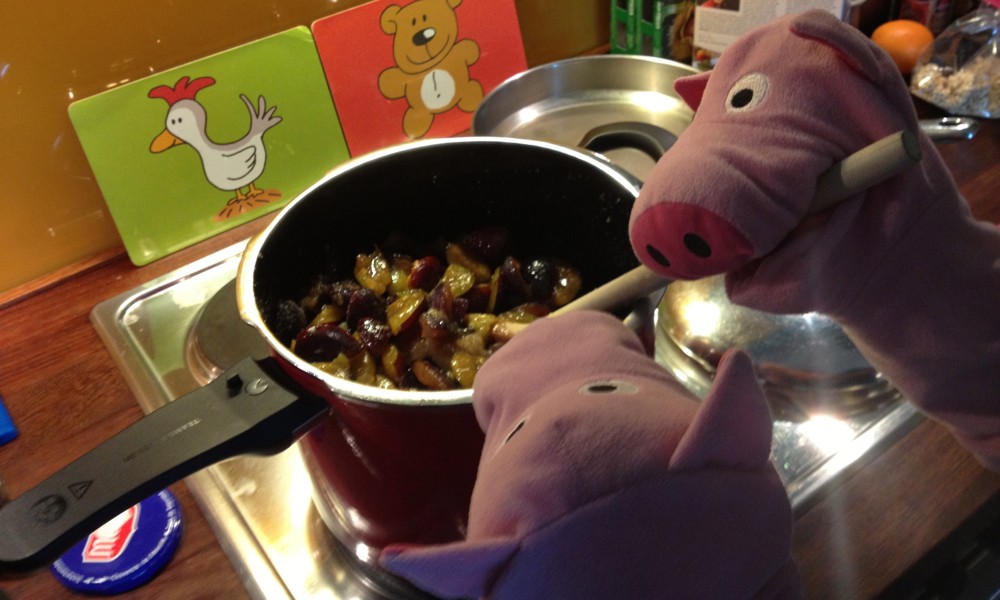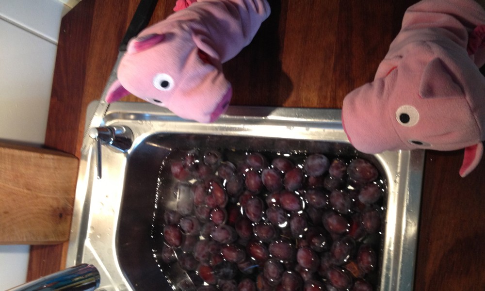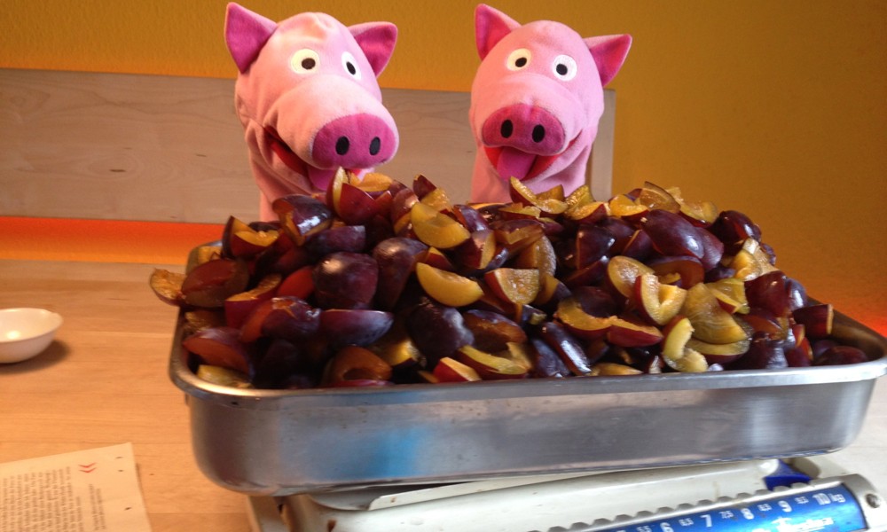Auf einer Tombola haben die Schweine eine Kiste Pflaumen gewonnen. Super! Und viel Arbeit, denn die Schweine haben sich entschlossen, Pflaumenmus zu kochen.