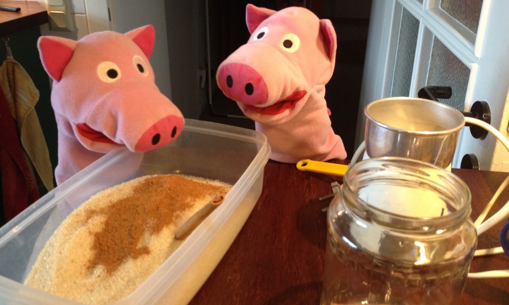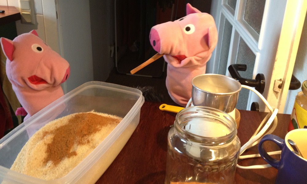 Grisarana har fått två vitlöks rivarna av porslin från Sverige. Den kan man också använda för ingefära. Grisarna älska ingefära te.