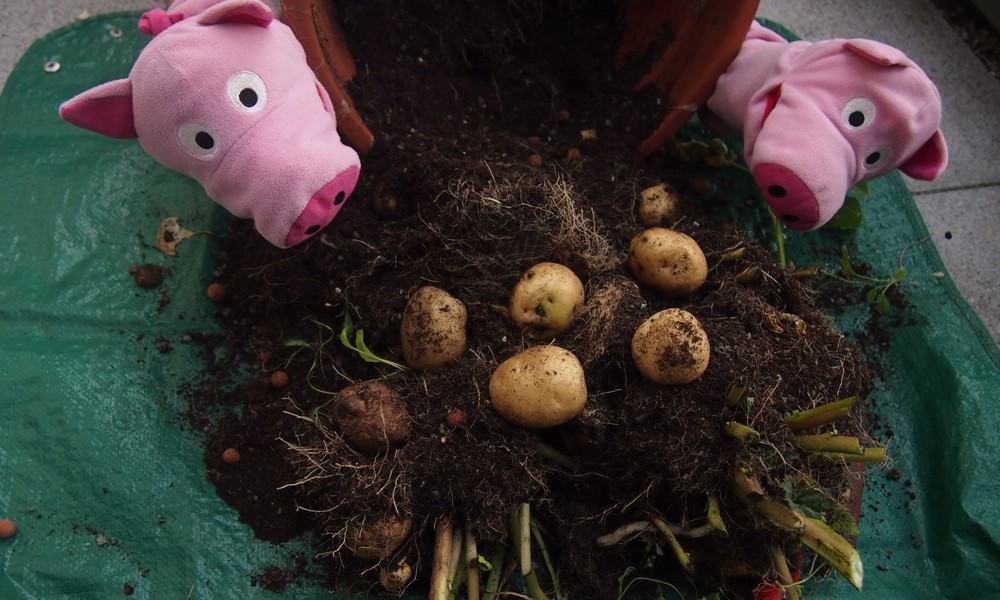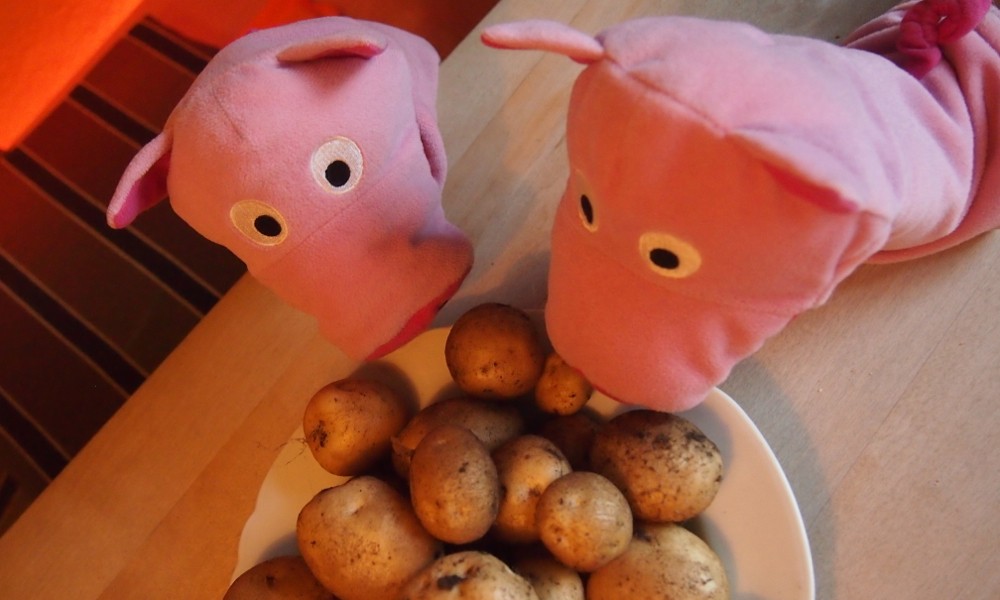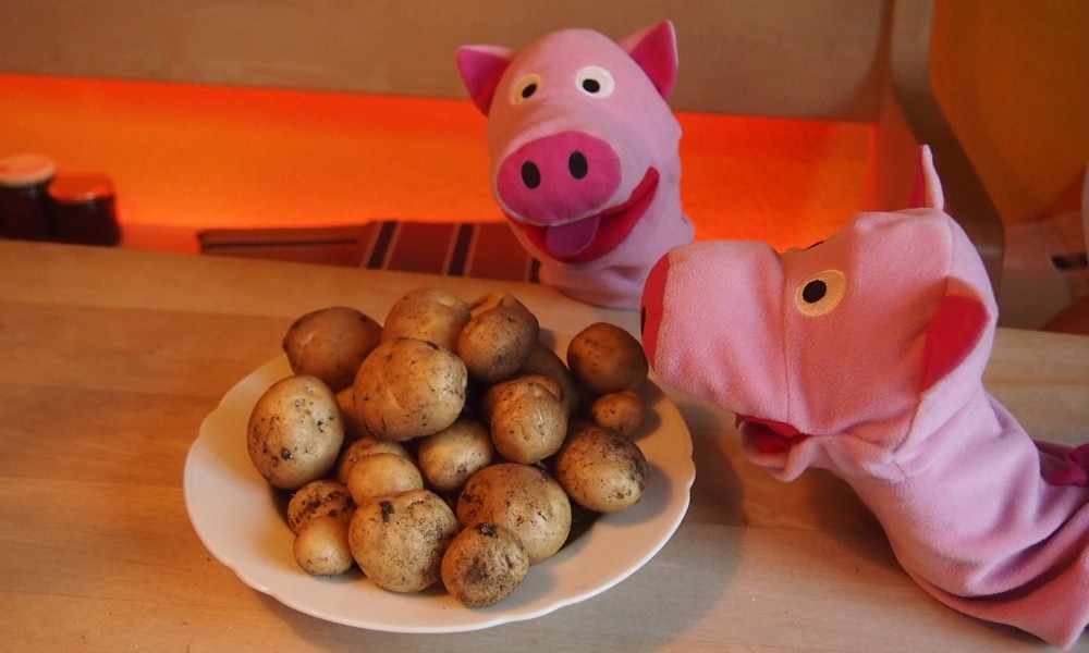 Endlich ist es wieder soweit: Die Kartoffeln sind reif! Nach anfänglich großer Trauer wegen der verwelkten Kartoffelpflanzen können die Schweine in einem außergewöhnlichen Genuss schwelgen. Sie hatten ja im Frühjahr in Essen Setzkartoffeln der Sorte "British Queen" erworben.