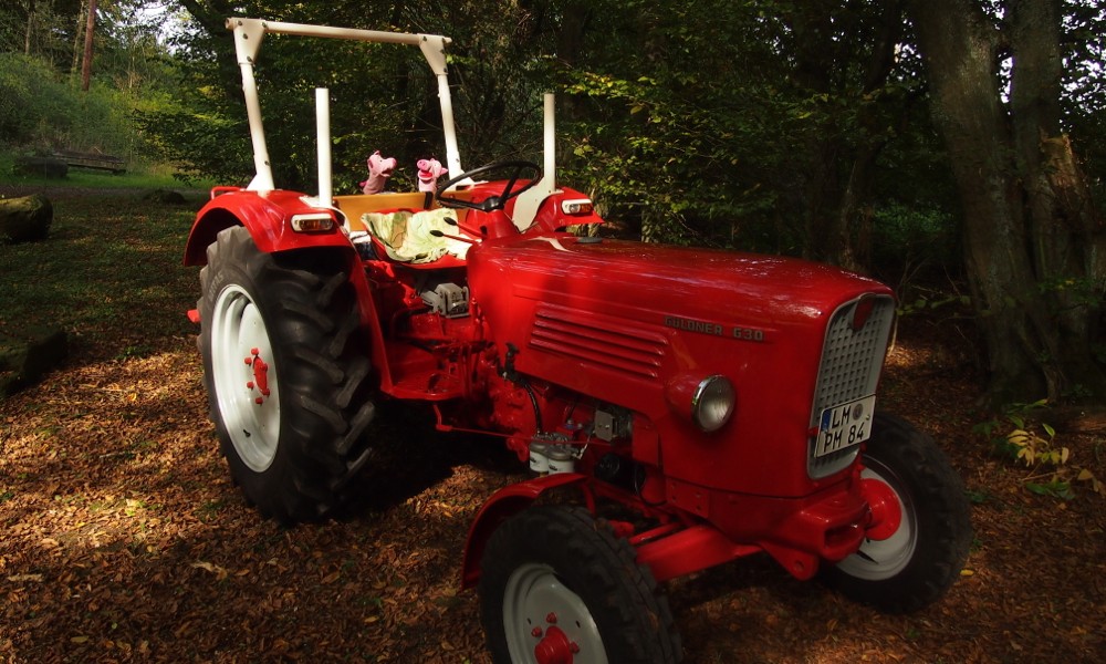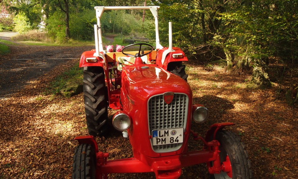 Die Schweine waren am Wochenende in Westerburg. Dort waren die Äpfel reif, am Golfplatz war Übelkeit angesagt. Schließlich wurde noch eine Fahrt mit dem Trecker (Güldner G30) gemacht.