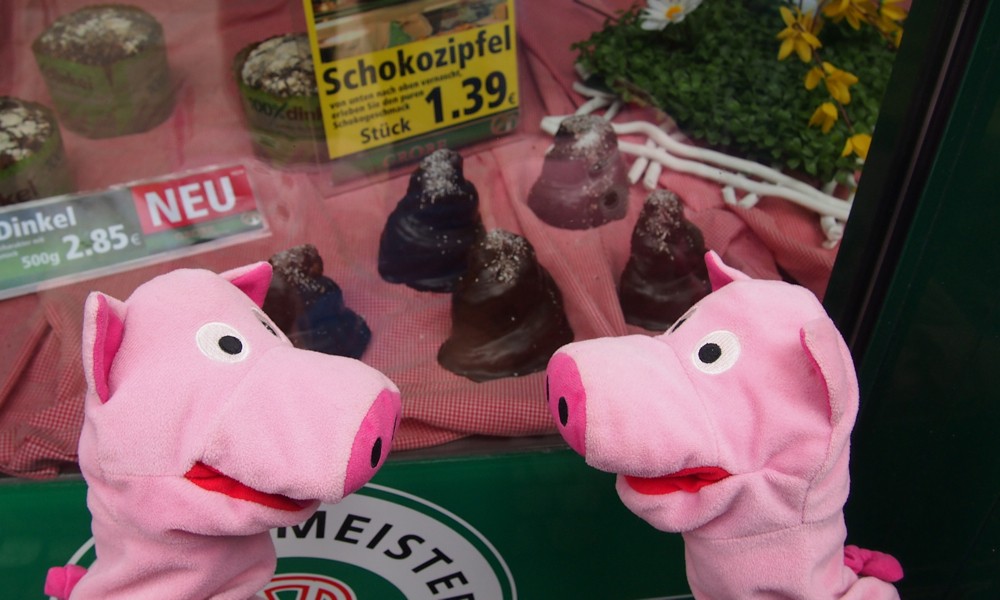 • Die Schweine überlegen, ob sie sich vor der Wanderung Kosakenzipfel kaufen.