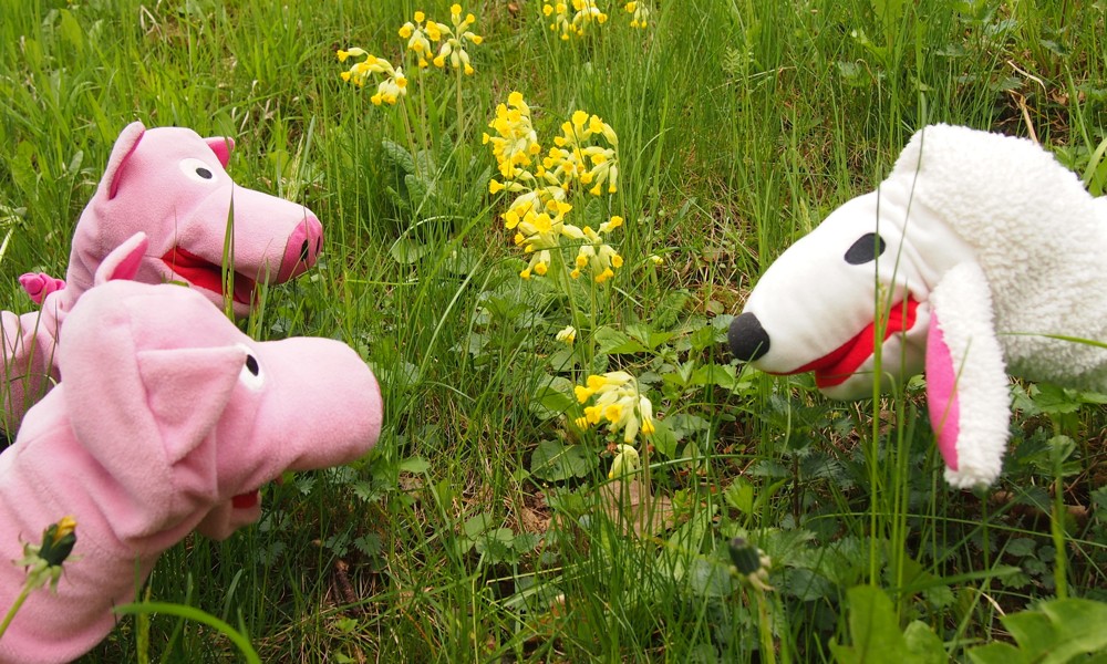 • Zusammen bewundern Schweine und Schaf die Schlüsselblumen.