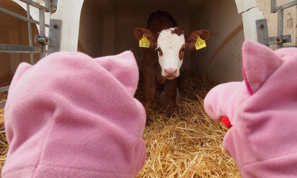• Die Schweine sind dem Kalb wohl nicht geheuer.